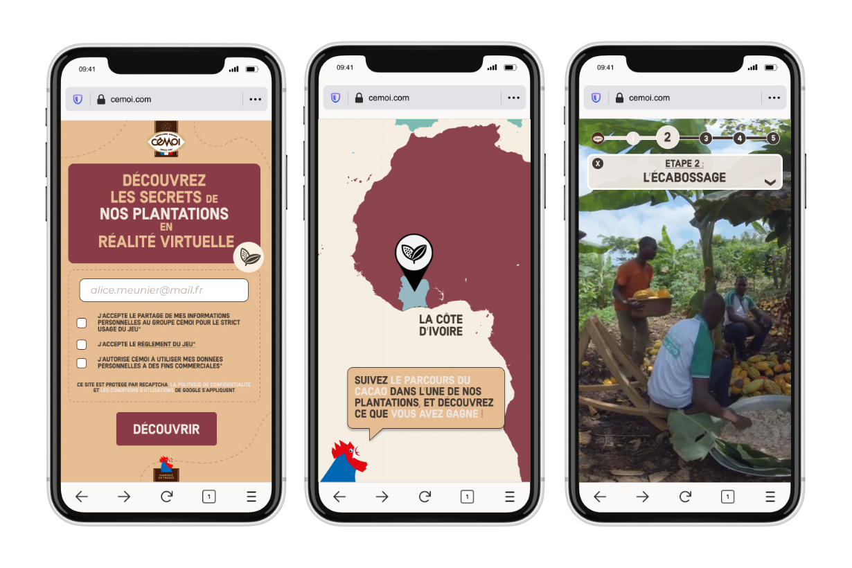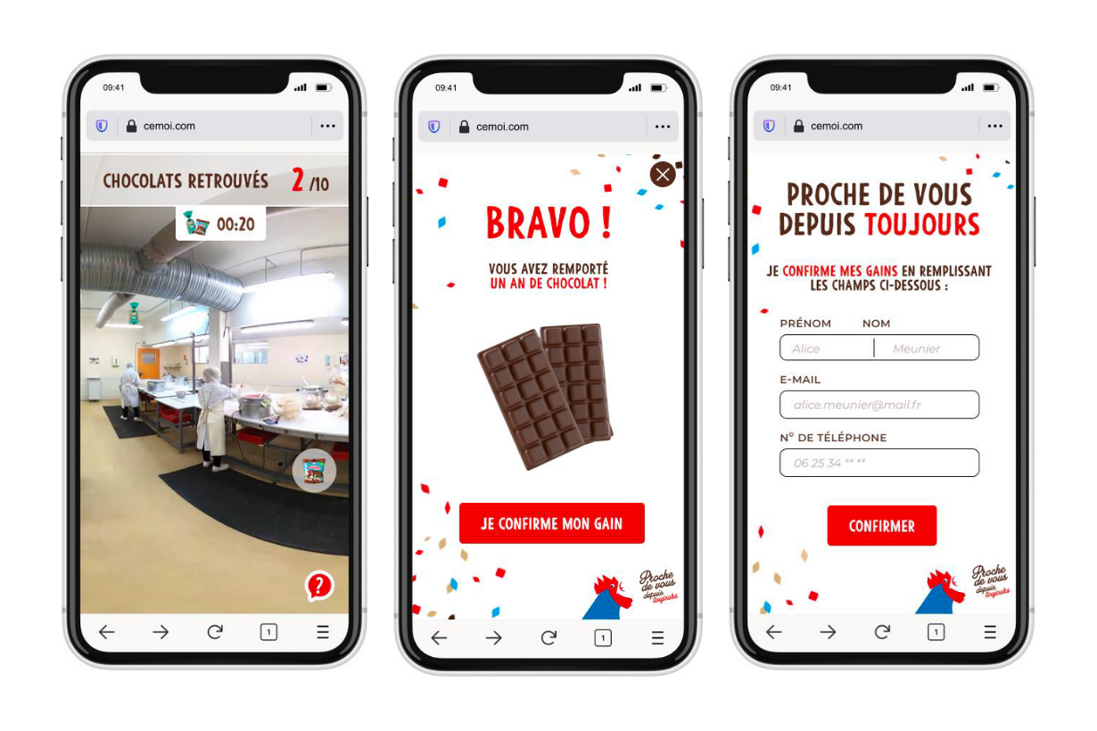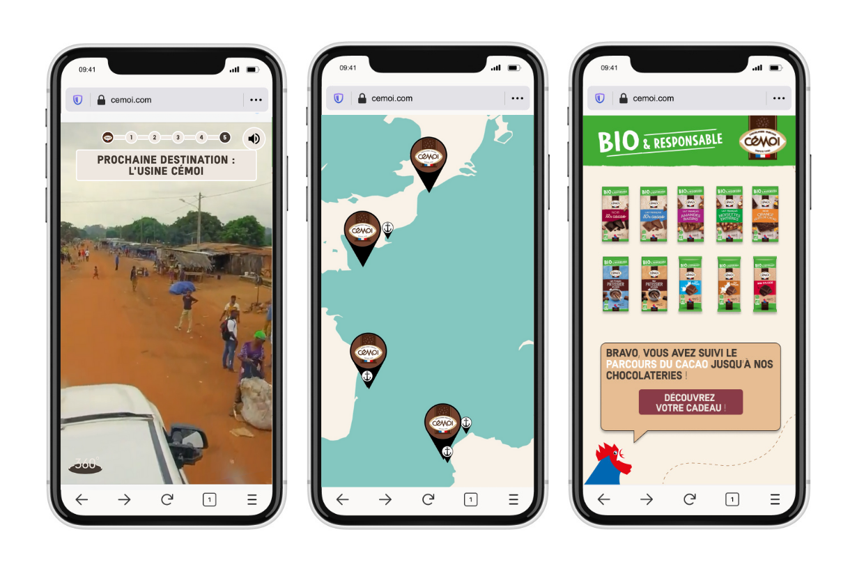 Nous avons imaginé pour Cémoi, un mode d’interaction inédit avec ses publics à travers une webapp à l’année qui héberge des expériences immersives au fil des temps forts commerciaux des marques du Groupe.